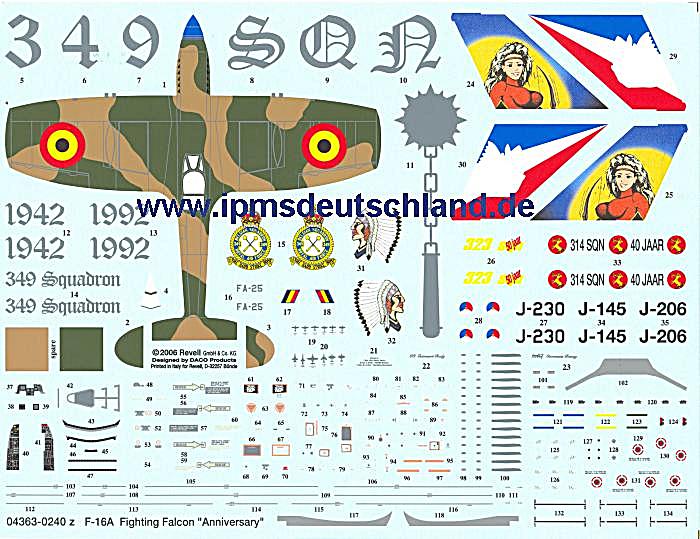 Wie bei Revell üblich ist die Bauanleitung hervorragend detailliert und es wird ausführlich auf die Unterschiede der einzelnen Maschinen hingewiesen. Ebenso gibt es genug Zubehör für die Lastenträger. Und Decals gibt es für die Bewaffnung und die Tanks ebenso. Die Decals (Abziehbilder) wurden bei DACO Products in Belgien erstellt. Ein Problem tut sich bei mir auf: Die Spitfire ist sehr gut wiedergegeben, jedoch ist es nahezu unmöglich diese auf das Modell zu bekommen, da die Kabine platt ist. Eine Lösung des Problems wären die zusätzlichen Decalteile und eine teilweise weiße Lackierung der Seitenleitwerksfinne.