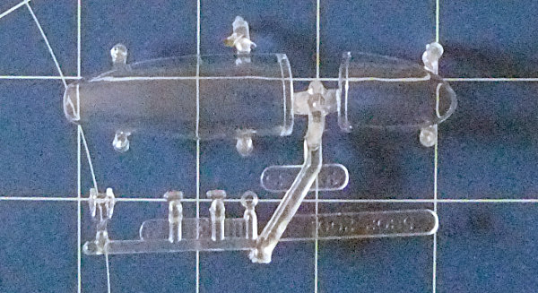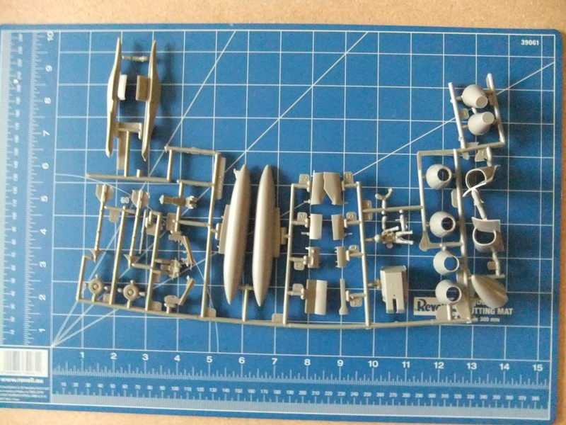 Das Modell, das heißt die Einzelteile, sind in der Monogram-typischen Machart gefertigt. Dem Alter der Teile entsprechend sind die wenigen Gravuren erhaben gestaltet. Die Prägung und Detaillierung von dem Cockpit sowie den Fahrwerksschächten wären durchaus als zufriedenstellend zu betrachten, wenn nicht der Eindruck einer etwas verwaschenen Fertigung den gesamten Bausatz dominieren würde.