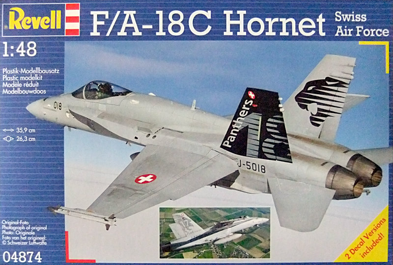 Bei diesem Bausatz von der Firma Revell aus Westfalen Bünde,handelt es sich um ein Modell der Hornet, welche die Schweiz seit 1996 in Lizenz für ihre Fliegergeschwader fertigt. Der Bausatz selbst wurde ursprünglich von der Firma Mongram produziert und von Revell vor kurzem wieder aufgelegt.