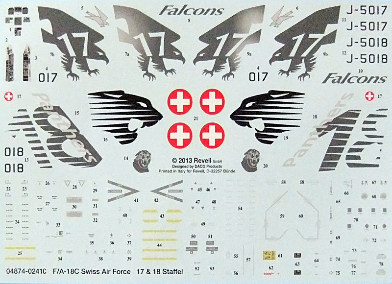 In dem standardisierten Faltkarton befinden sich laut Aufschrift 97 Einzelteile und ein Decalbogen mit den Emblemen für eine von zwei möglichen Hornets der Schweizer Luftstaffeln. Beide Maschinen mit Sondermarkierungen am Leitwerk gehören zum Fliegergeschwader 11, welches in der Westschweiz auf dem Militärflugplatz Payerne stationiert ist.