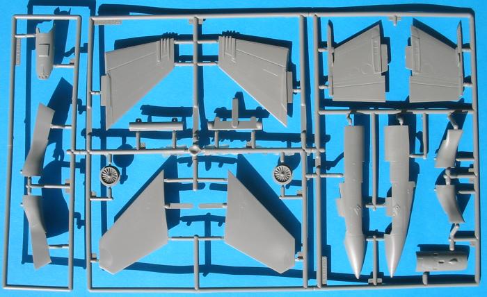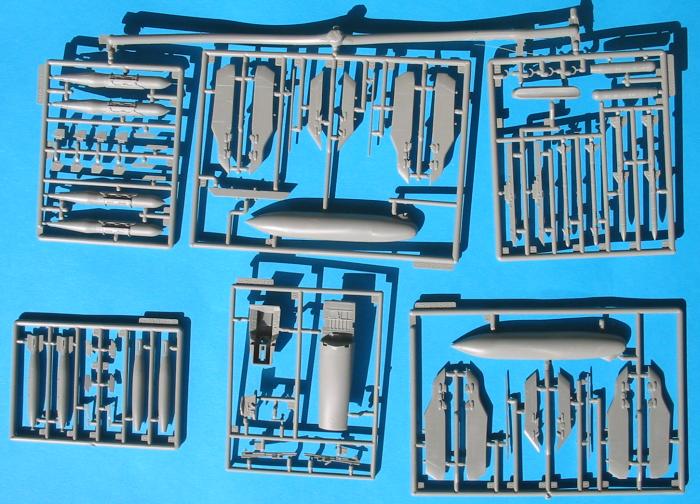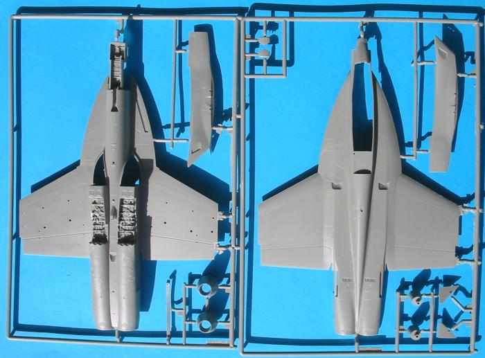 Wie zu erwarten, ist der Bausatz so konstruiert, dass eine zweisitzige F- Version in Zukunft vorgesehen ist. Trocken zusammen gehalten stellt sich die Passgenauigkeit als sehr gut heraus. Das gilt übrigens auch für die Abmessung und die gesamte Konstruktion, an der Mitglieder der IPMS - USA beteiligt waren. Cockpit, Lufteinläufe, Fahrwerk, Schächte und belastete Reifen ebenso, wie Waffenzuladungen sind hervorragend modellgerecht detailliert. Sogar Feinheiten wie das Keybord am Bugschacht (als Klarsichtteil) sind enthalten.