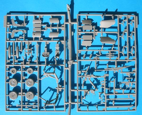 Bausatz: Werfen wir einen Blick in den Karton, der zu einem super Preis im Handel ist: Wirklich "super" ist das "Superdecal" für vier Versionen und vollen Stencelling, das allein wohl 12 bis 15 Euro kosten würde. 15 Spritzlinge sind in Gruppen gut verpackt, zwei davon als Klarsichtteile. Die Oberflächen sind fein gestaltetet, so fein, dass ein Pinselauftrag alles ruinieren würde.
