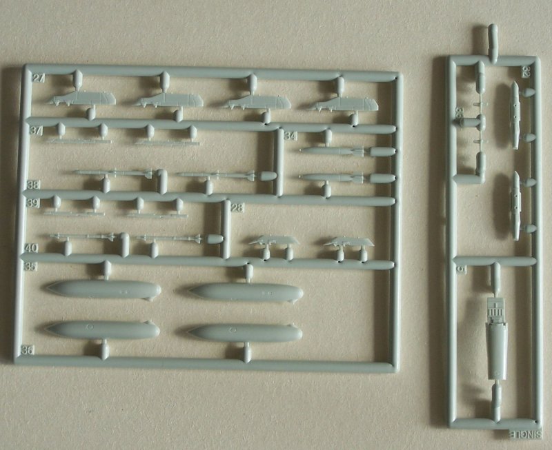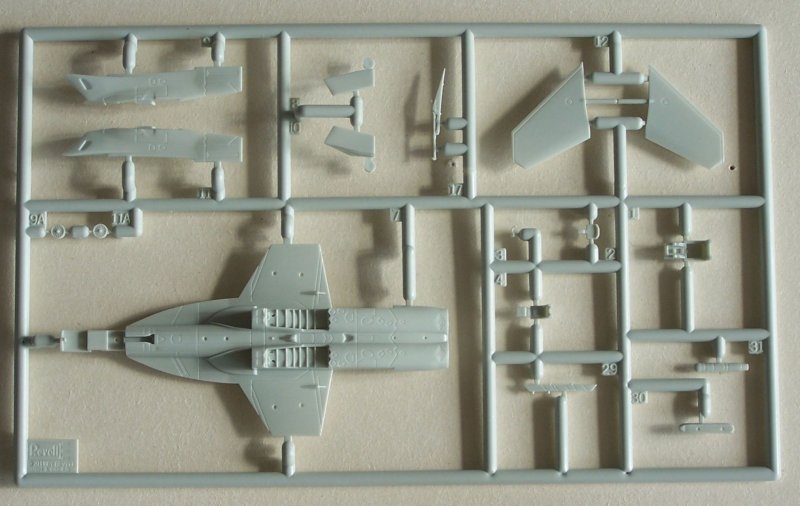 Die Teile: Es handelt sich um einen mit grauem Plastik erstellten Spritzgussbausatz. Die Teile sind sauber gespritzt und verfügen über zeitgemäße, versenkte Gravuren. Die Form scheint von 2011 zu sein, zumindest steht dies auf dem Schild des Spritzgusses.