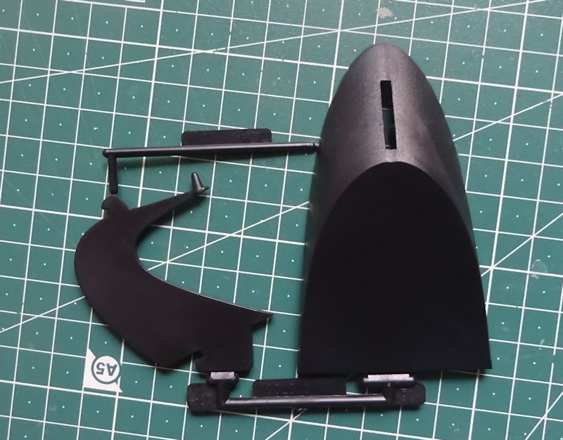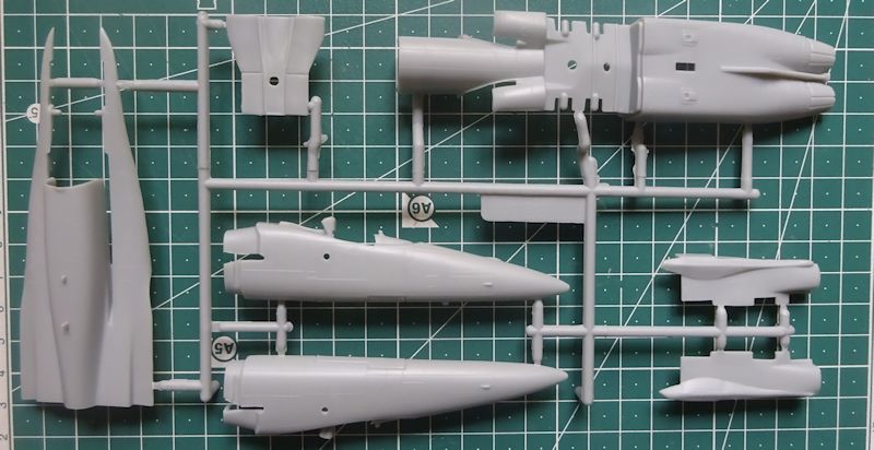 Bausatz: Die Wiederauflage des Monogram Bausatzes von 1979 kommt in einer bunten Faltschachtel daher. Diese enthält zwei graue Gussäste, eine klare Cockpithaube und einen Ständer, insgesamt 14 Teile.