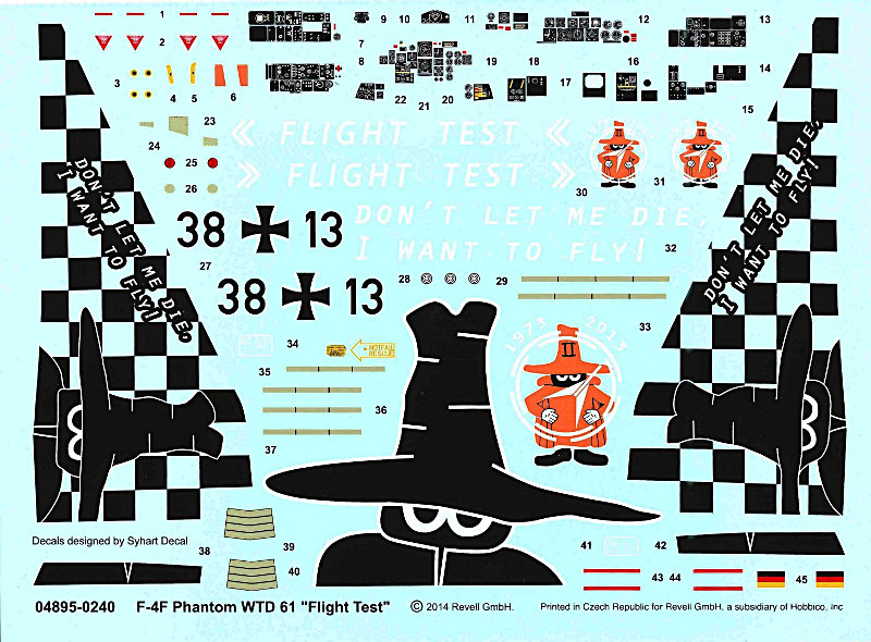 Die Decals, die es erlaben diese spezielle Phantom II zu bauen. Zwei große Bögen, größer als DIN A3, sauber und versatzfrei gedruckt. Auf dem Karton ein original Foto dieser Phantom. Der Bauplan, als Heft in schwarz weiß ausgeführt. Die Farbangaben beziehen sich auf REVELL Farben.