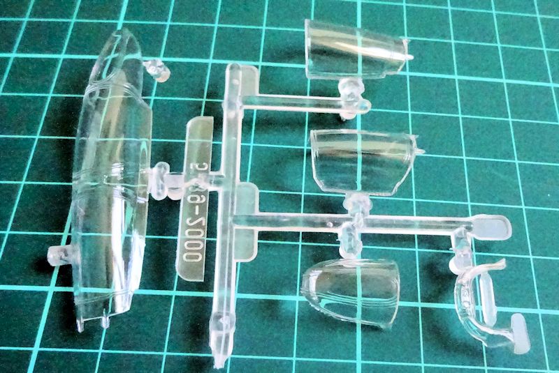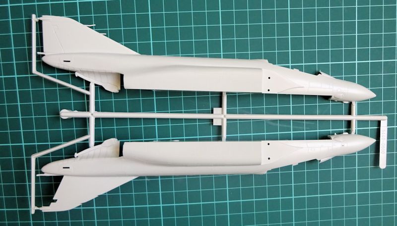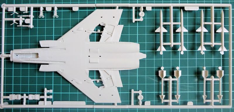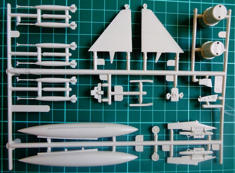 Der Bau beginnt mit dem Cockpit. Hier sind die Sitzschalen der Schleudersitze bereits in der Cockpitsektion fest angegossen. Für die Instrumentenbretter gibt es Decals. Eine Pilotenfigur kann auch genutzt werden. Es liegen zwei Cockpithauben (offen, geschlossen) bei. Die Tragflächen sind so gestaltet, dass sie die entsprechenden Winkel vorgeben.