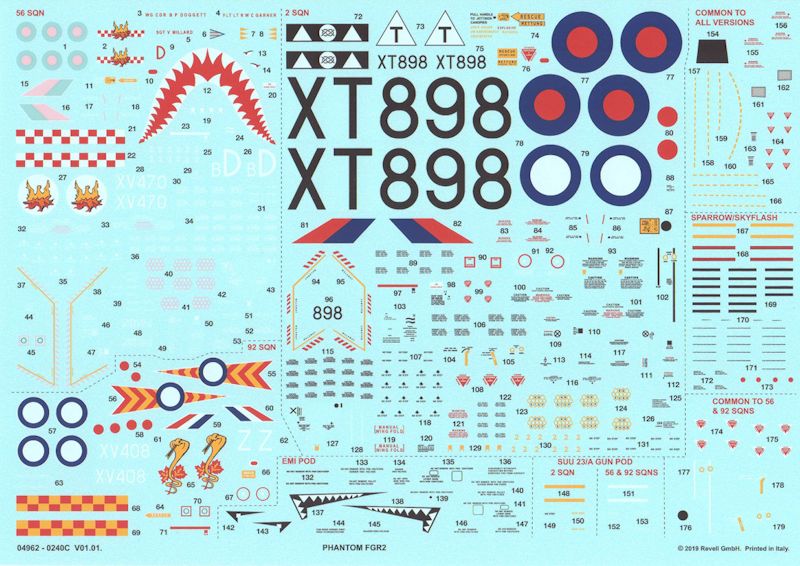 Bausatz: Revell legt die von 2004 bekannte Phantom FGR. 2 neu auf. Der Bausatz stammt aus Formen von Hasegawa aus dem Jahr 1980. Alle Spritzlinge (mit Ausnahme der Klarsichtteile) sind in einem einzigen Plastikbeutel verpackt, was zum ein oder anderen Kratzer durch Reibung führt. Verwendet wurde das für Hasegawa typische, glatte, aber recht spröde Plastik.