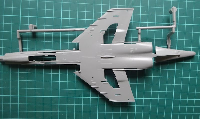 Der Bausatz besteht aus zwei Rumpfhälften. An diesen sind die Tragflächen und Höhenleitwerke bereits angespritzt, wodurch die Montage rascher vonstatten geht.