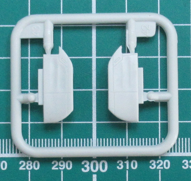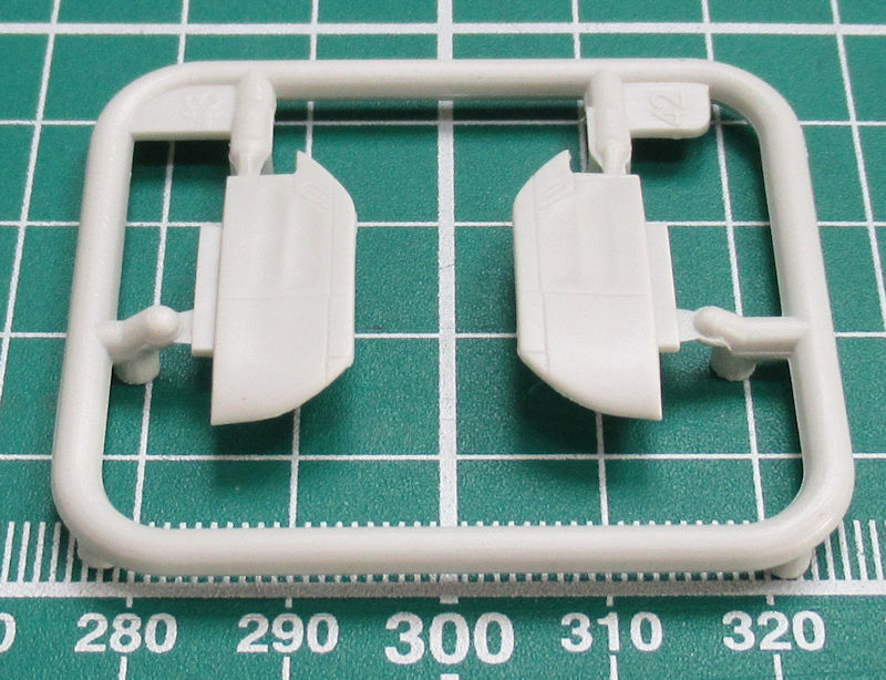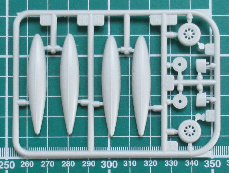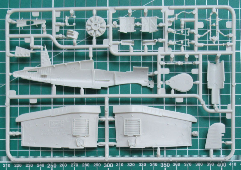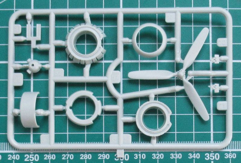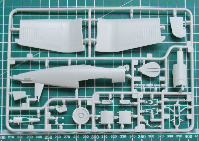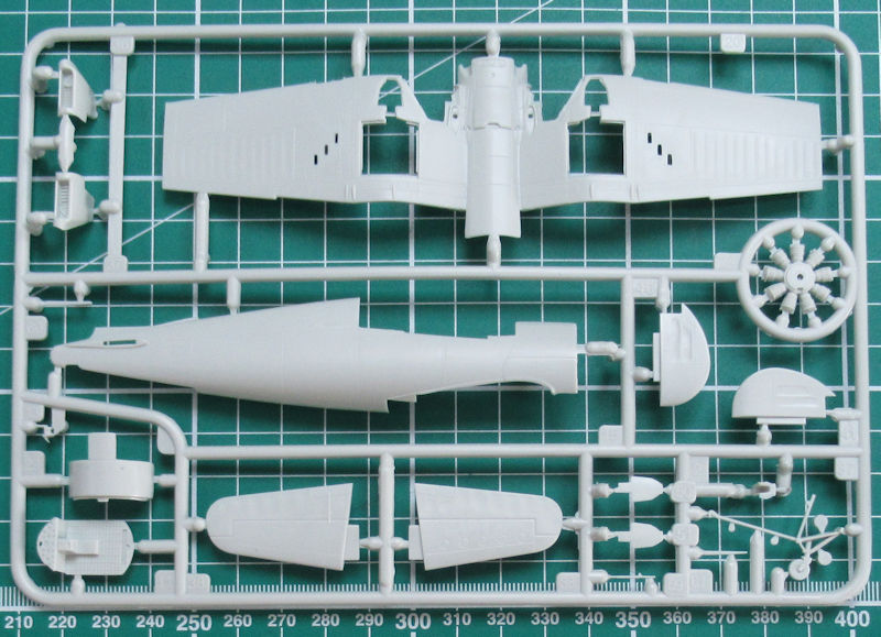 Höhen- und Seitenruder haben auch scharfe Hinterkanten. Der Motor entsteht aus drei Teilen. Ich persönlich finde die Darstellung des R-2800 etwas vereinfacht. Das habe ich bei Revell aus der Kiste schon besser gesehen. Alternativ kann man die Kühlluftklappen offen oder geschlossen darstellen. Das Heckfahrwerk besteht aus einem Stück. Die Felgen der Hauptfahrwerksräder sind durchbrochen. Auch ansonsten hat Revell es beim Hauptfahrwerk gut gemacht. Als Option gibt es zwei Abwurftanks. Die Kanzel besteht aus zwei Teilen. Das hintere Stück kann man lt. Bauanleitung in geöffneter Position fixieren.