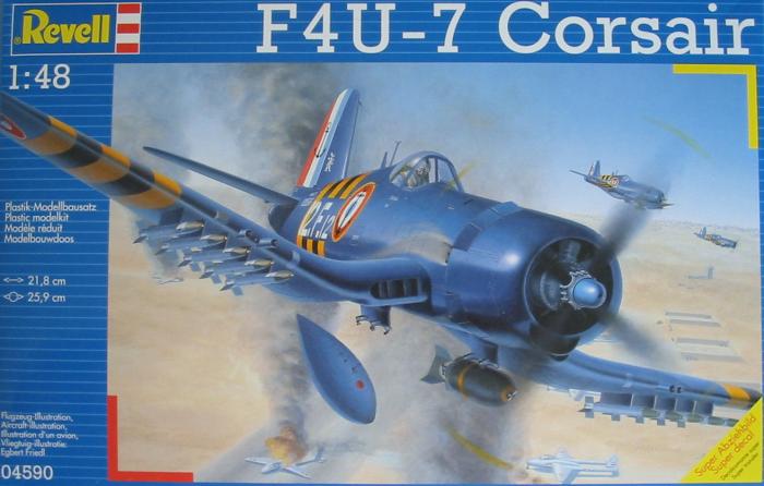 Vorbild: Während des 2. Weltkriegs erwies sich die F4U Corsair in verschiedenen Versionen bei über 64.000 Einsätzen als das überlegene Marineflugzeug, welches sich die US Navy bei der Ausschreibung erhofft hatte. Mit einer Verlustrate von 11,3 : 1 (nur 189 Corsair gingen verloren) hatte sie die beste Bilanz aller Jagdflugzeuge im 2. Weltkrieg. Als die französischen Marineflieger der Aeronavale in den 50er Jahren nach einem Jäger für ihre Flugzeugträger suchten, fiel die Entscheidung zugunsten der Corsair. Man suchte sich aus den bereits gebauten Versionen das Beste aus und ließ sich von Chance Vought eine "französische" Corsair mit der Bezeichnung F4U-7 bauen. Die erste Maschine aus dieser Serie flog am 2. Juli 1952 während die letzte im Dezember 1952 vom Band lief. Bei den Einsätzen in Indochina (Vietnam) bis zum Fall von Dien Bien Phu am 7. Mai 1954 bewährte sich die Corsair als Rückgrat der Marineflieger. Bereits zwei Jahre später waren die französischen Corsair erneut an Kriegshandlungen beteiligt, diesmal gegen Ägypten um den Zugang zum Suez-Kanal. Auch im Algerien-Krieg wurden neben der F4U-7 auch eine Reihe von AU-1 Corsair eingesetzt. Erst Ende 1964 wurden die noch verbliebenen F4U-7 Corsair ausgemustert.