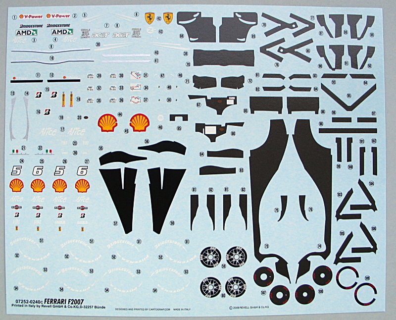 Die Bauanleitung ist in gewohnter Revell Qualität gehalten. In 25 Bauabschnitten erhält man eine Replik des Ferraris F 2007 der letztjährigen Saison. Der Decalbogen ist Revell wieder außerordentlich gut gelungen. Für die Carbonteile liegen Schiebebilder bei. Auch für die Radkappen in Kohlefaser u. Alufelgen liegen Decals bei Markierungen für drei Grand Prix sind möglich: USA, Großbritannien und Brasilien.