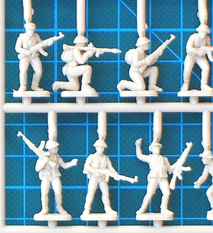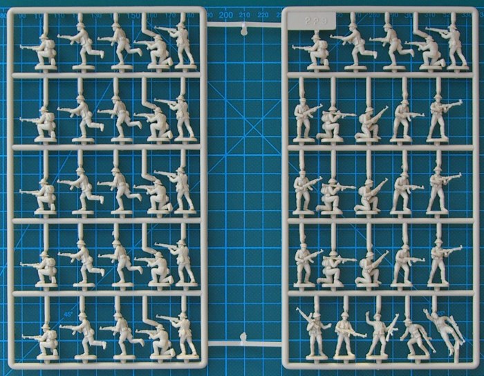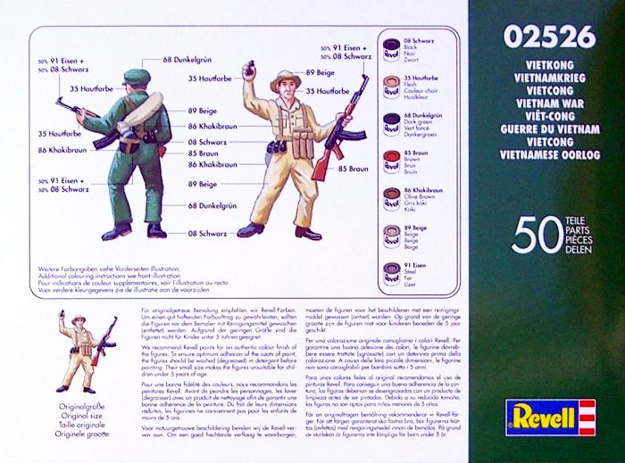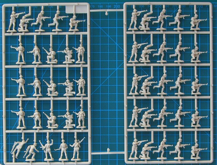 Bausatz: Dieses Set enthält 50 beige Figuren, die zum Glück in recht hartem Kunststoff abgespritzt sind. Die Posen sind recht gut und die Detaillierung geht auch in Ordnung. Ich kann die Bewaffnung und Ausrüstung erkennen. Ein erheblicher Nachteil ist, dass jeweils fünf Posen sechs Mal vorhanden sind. Das schränkt natürlich die Verwendung ein. Die Bemalungshinweise sind von der Sache her ausreichend und beziehen sich auf Revell-Farben.