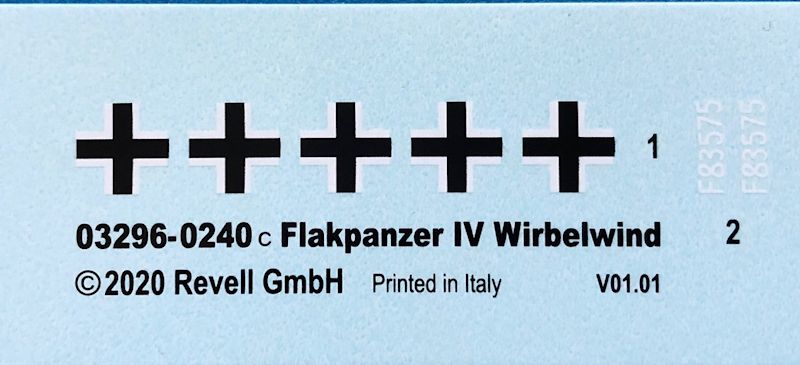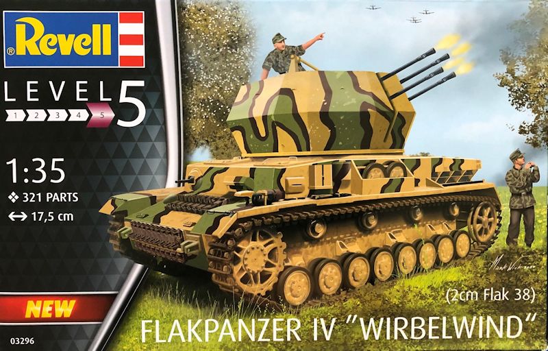 Nun bietet auch Revell den Wirbelwind in einem stabilen Karton mit Frontlaschen an. Das Deckelbild entspricht dem Revell üblichen Layout, wobei für den Bausatz der Schwierigkeitsgrad 5 angegeben wird. Aus meiner Sicht wäre ein Level 4 eher zutreffend. Der auf dem Karton abgebildete Ostwind entspricht hinsichtlich Form und Details dem Original, jedoch wirkt die Farbgebung mit dem stark ausgeprägtem Dreifarben Tarnmuster sehr plakativ.