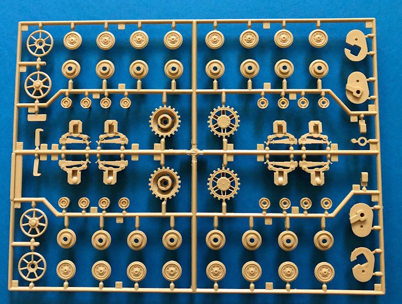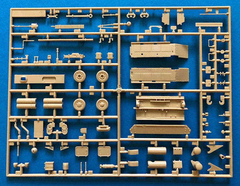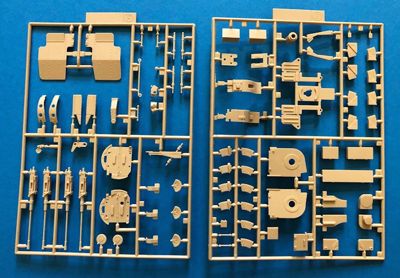 Im Karton finden sich fünf Spritzgussäste sowie zwei einzelne Wannenteile aus sandgelbem Plastik. Ein direkter Vergleich mit dem Bausatz von Academy weist darauf hin, dass Revell diese Teile unverändert übernommen hat. Zusätzlich enthalten sind zwei Rahmen mit Polycaps für das Laufwerk und zwei Kettenelemente aus flexiblem Material.