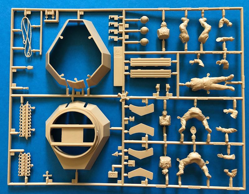 B: Turmteile mit vier Figuren Auf den ersten Blick erschienen mir die vier beiliegenden Figuren für das Flugabwehrgeschütz ziemlich unattraktive, da die Uniformen sehr "schwammig" aussehen. Bei genauerer Betrachtung der Teile war ich verblüfft, denn die Gesichter und Hände der Figuren sind ausgezeichnet und der anfangs negative Eindruck hinsichtlich der Uniformen ist darauf zurück zu führen, dass die Flak Crew in dicken Winteruniformen dargestellt sind. Insofern musste ich mein erstes Urteil revidieren und kann hier nur sagen, dass man mit einer guten Bemalung diese Figuren problemlos verwenden kann.