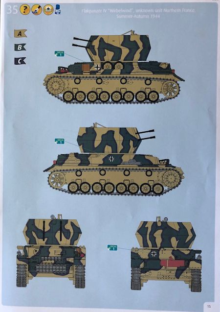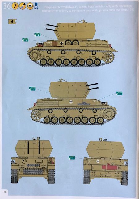 Bauanleitung/ Bemalung: Der Bauplan besteht aus einem in Farbe gedruckten 16-seitigen A4-Heft. Die Montage der Teile wird in 34 Baustufen klar und eindeutig dargestellt, Farbangaben für Einzelteile mit Bezug auf die Farben aus dem hauseigenen Sortiment findet man bereits in den einzelnen Baustufen und zwei Bemalungs- und Markierungsvorschläge auf den letzten Seiten des Bauplans. Als Markierungen findet man auf dem Decalbogen lediglich Balkenkreuze und eine Fahrzeugnummer.