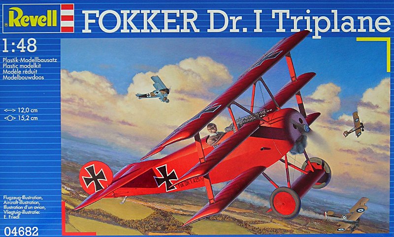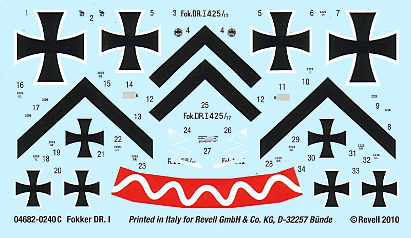 Bemalungen Auf der üblichen Revell-Bauanleitung sind zwei Bemalungsvarianten in Grautönen abgedruckt. Die Abziehbilder sind von Cartograf gedruckt, leider aber wieder nach Revell-Marotte Stumpfmatt. Die überstehenden Trägerfilme sind aber extrem schmal, so dass es vielleicht kein unüberwindliches Problem ist, diesen zu kaschieren. Außerdem gibt es ja auch den Zubehörmark; recht teuer aber empfehlenswert ist z.B. der große Jagdgeschwader II Satz mit 30 Dreideckern von Pheon Models. Aber EagleStrike, Aeromaster usw. haben auch einiges im Programm (oder auch gehabt, was man aber oft noch bekommen kann).