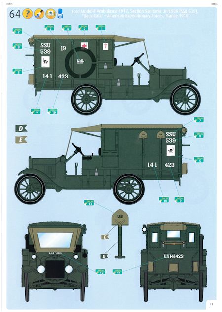 Bauanleitung/ Bemalung: Die Bauanleitung für das Auto hat 23 Seiten, und führt anschaulich Revelltypisch durch die Bauabschnitte. Auf den letzten zwei Seiten sind die Farbvorschläge (sowohl für die amerikanische, als auch die französische Ausführung) abgedruckt. Es wird das Revell Farbsystem verwendet.