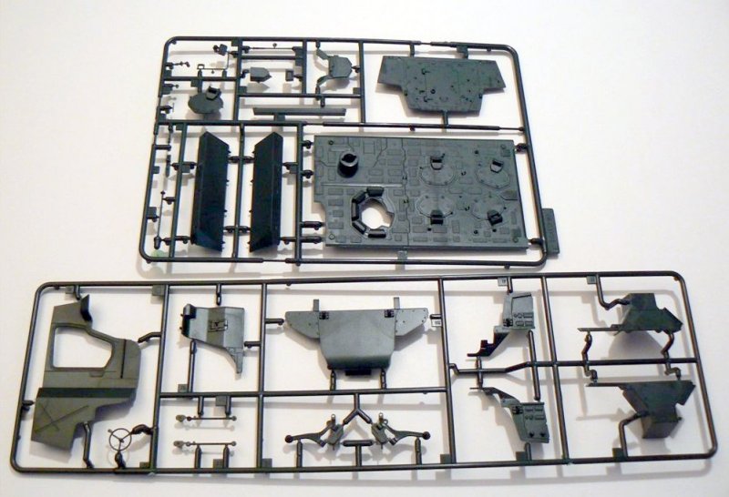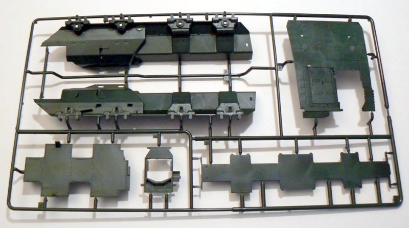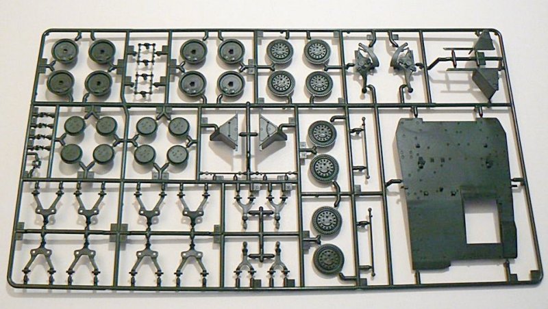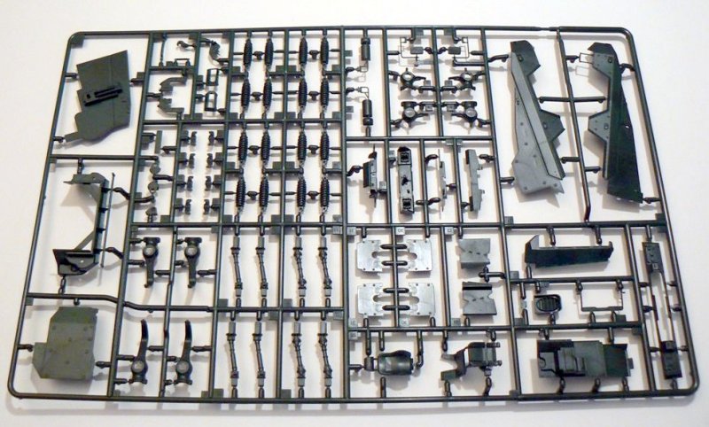 Alles in Allem 223 Einzelteile, sind im Bausatz enthalten. Die Detaillierung ist sehr gut und viele Teile sind sehr filigran, so dass beim Heraustrennen Vorsicht geboten ist. Alle Teile sind sauber gegossen und kamen gut aus der Form. Auswerferpunkte finden sich alle auf der Rückseite der Bauteile und müssen so nicht verspachtelt und verschliffen werden. Das Fahrwerk des BOXERS ist sehr gut wiedergegeben und verschlingt allein 13 Bauabschnitte.