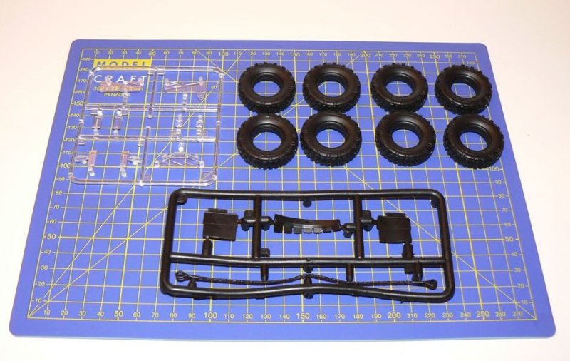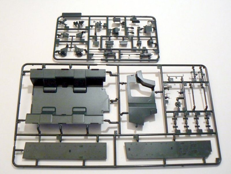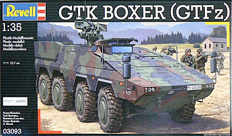 Der Bausatz: Mit dem Boxer ist Revell eine sehr gute Nachbildung des Originals gelungen. Der Bausatz beinhaltet 7 grüne Spritzgußrahmem und einem Rahmen mit Klarsichtteilen. Reifen und Abschleppseil sind aus schwarzem Vinyl gefertigt. Leider fehlen auf den Reifen die Hersteller Beschriftungen.