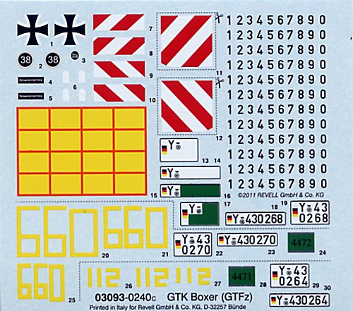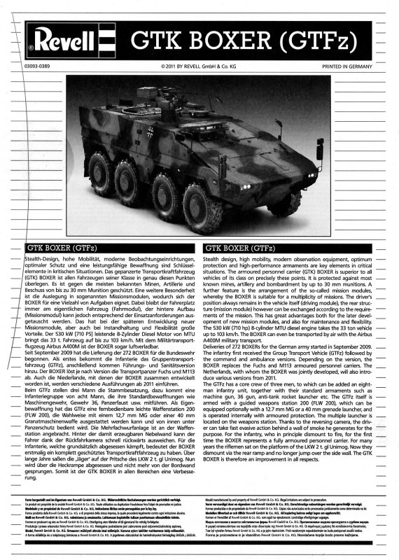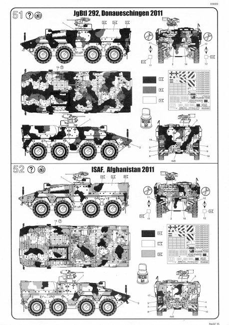 Decals und Bemalung: Beim Testshot war der Decalsatz noch nicht vorhanden. Hat man den Kaufbausatz in der Hand kann man aus dem Decalbogen 4 Fahrzeuge bauen. Zwei Fahrzeuge des JgBtl 292 (Gefechtsübungszentrum 2011), ein Fahrzeug des JgBtl 292 (Donaueschingen, 2011) und schließlich ein Boxer der ISAF, Afghanistan.