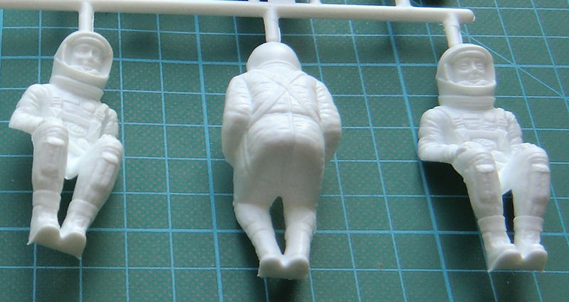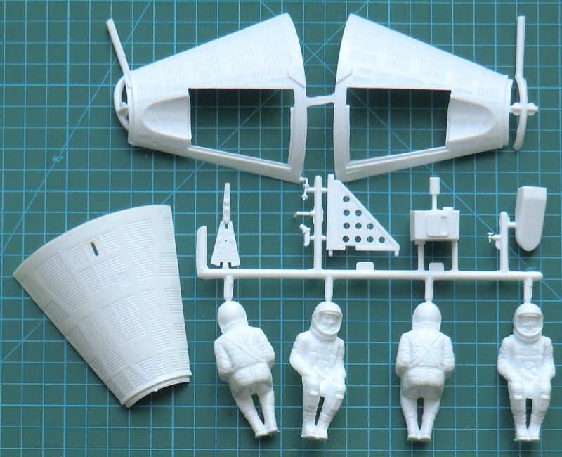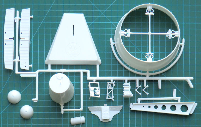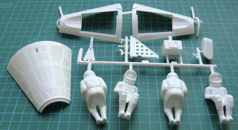 Die Abspritzung der Bauteile ist trotz des Alters der Form gut. Ein paar Teile liegen lose in der Tüte und Revell hat die Spritzlinge weiter zerschnitten. Aus diesen Teilen kann ein Raumschiff entstehen, wie es im All flog. Im Innern gibt es eine Inneneinrichtung und zwei Astronauten. Durch die Klarsichtteile der Helme kann man dann auch deren Gesichter sehen. Für die Instrumente gibt es noch Decals und das obwohl diese schön plastisch modelliert sind. Dafür gibt es inzwischen Decal-Set von Revell.
