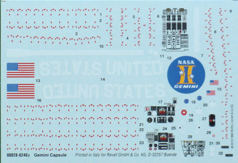 Die Präsentation des Gemini-Schiffes erfolgt auf einen beiliegenden Ständer. Der Decalbogen ist tadellos gedruckt. Mit Hilfe der Decals können alle Gemini-Raumschiffe aus den Jahren 1965 bis 1966 gekennzeichnet werden.