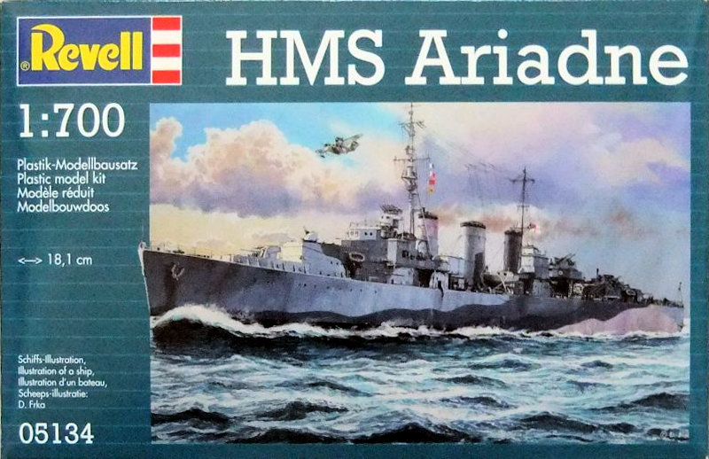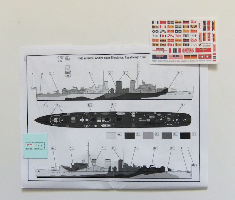 Bemalung: Der Bausatz sieht ein Schiff als Minenleger vor, wie es die Royal Navy 1943 im Pazifik eingesetzt hat. Die Ariadne wird laut Bauanleitung mit einer Splittertarnung in Dunkelgrau, Blaugrau, Teerschwarz und rötlich-brauner Farbe versehen.
