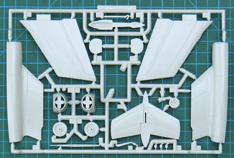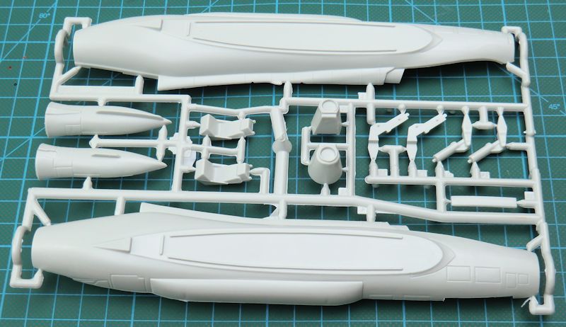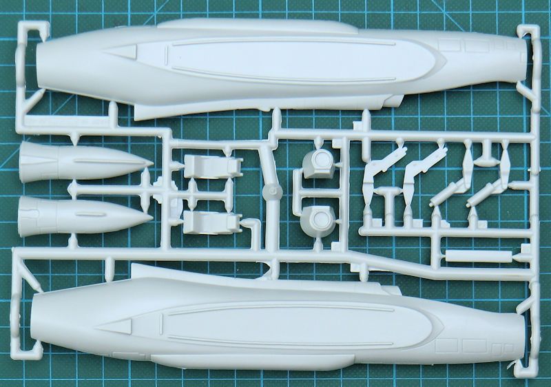 Die Bausatzteile präsentieren sich ohne Grat. Sie wirken aber irgendwie plump. Es fehlen auch die heute üblichen Strukturen. Das Cockpit ist recht einfach. Es gibt zwei rudimentäre Schleudersitze und zwei Pilotenfiguren. Diese füllen den Platz gut aus.
