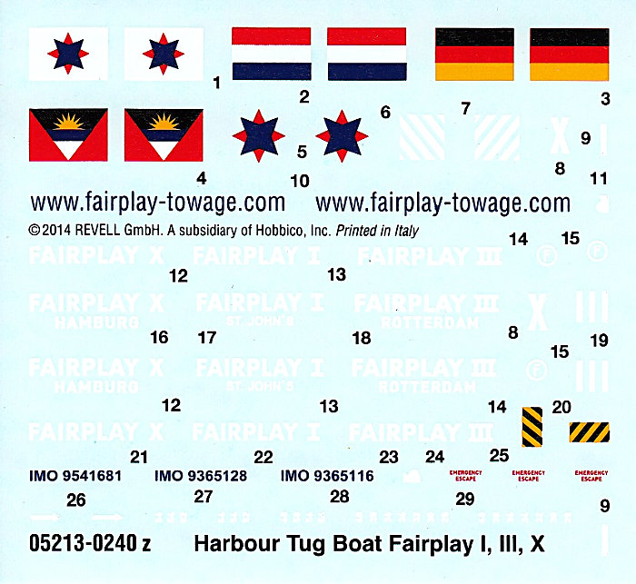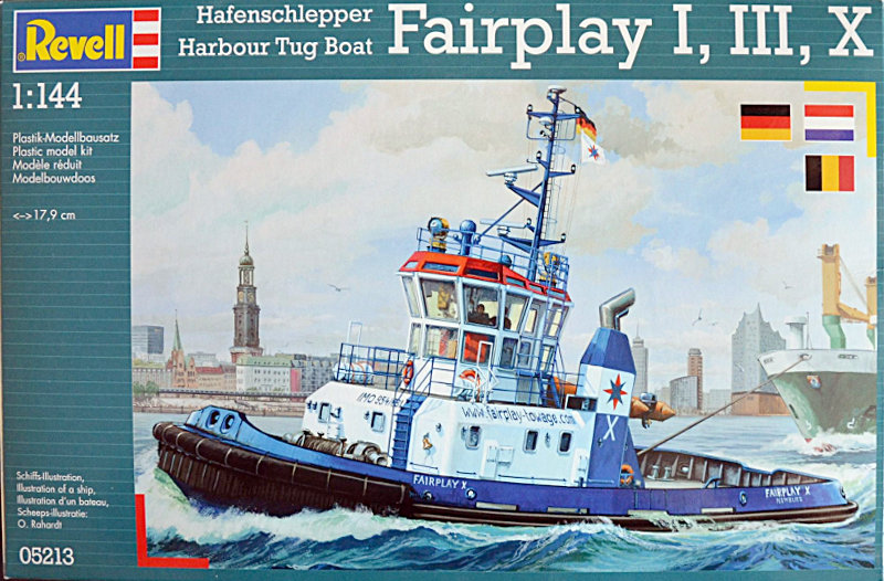Das Vorbild: Aus Revell: Wenn Schiffe nach tausenden von Seemeilen den Zielhafen anlaufen, liegt immer noch ein schwieriger Abschnitt vor ihnen. Hier kommen die Hafenschlepper ins Spiel, die die riesigen Schiffe sicher zur Anlegestelle bugsieren. Die Hamburger Fairplay Reederei hat dafür in zahlreichen Häfen Europas Ihre Schlepper stationiert. Das 1905 gegründete, traditionsreiche Schleppunternehmen setzt unter anderem die Schwesterschiffe Fairplay I in Rotterdam, Fairplay III in Antwerpen und Fairplay X in Hamburg ein.
