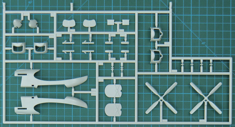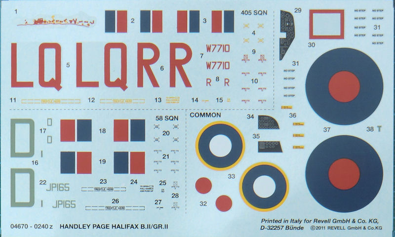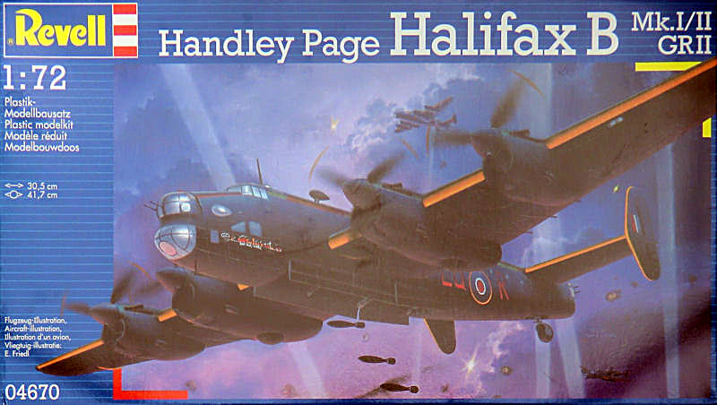 Bausatz: Revells Halifax ist der letzte britische Viermot der in 1/72 beim Bündener Unternehmen erschien. Die Form wurde in Korea erstellt. Es gibt feine Strukturen und gut gemachte Details. In der etwas instabilen extrem unpraktischen Schüttbox befinden sich gut verpackt elf hellgraue Spritzlinge mit 291 Bauteilen, 47 Klarsichtteile an einem Rahmen, ein Decalbogen und eine gut gemachte Bauanleitung.
