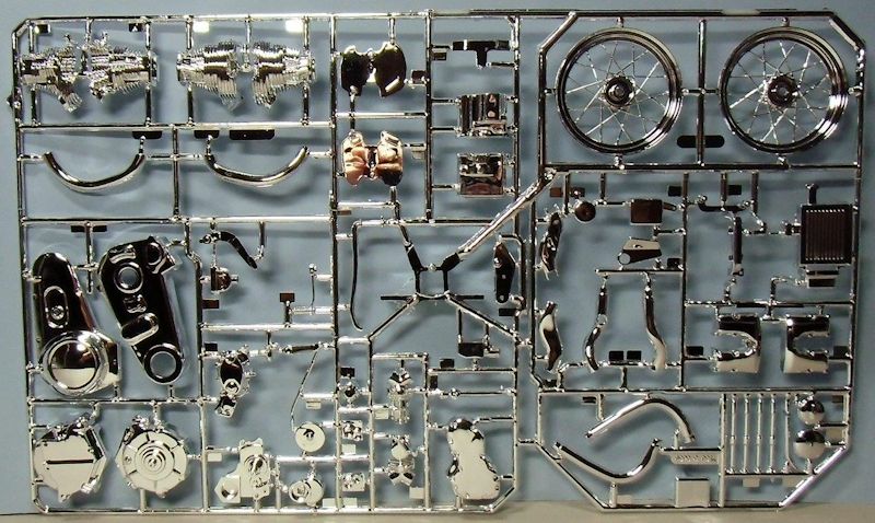 Geliefert wird der neue Bausatz in der von Revell bekannten Side-Open-Box, mit einer wie immer sehr guten Motorrad-Illustration. Der Bausatz beinhaltet ca.163 Bauteile die in hellgrau, klar und Chrom abgespritzt sind. Ferner befinden sich 2 Gummi Reifen, Vinyl Kabelmaterial und die bekannten sehr guten Decals in der Box. Dank der neuen farbigen 20 -seitigen, sehr übersichtlichen Bauanleitung (mit ausführlichen Farbangaben) dürfte der Zusammenbau dem Anfänger, wie auch dem fortgeschrittenen Modellbauer keine Schwierigkeiten bereiten.
