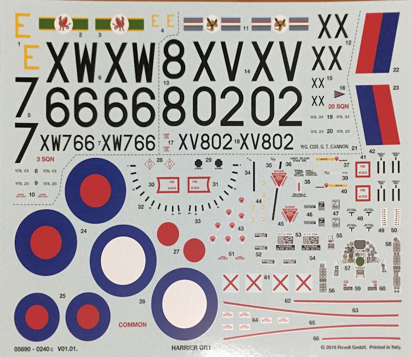 Bauanleitung/ Bemalung: Die Bauanleitung ist farbig und übersichtlich gehalten. Insbesondere für die Bemalung ist die farbige Darstellung von Oberseite, Unterseite und beiden Seitenteilen sehr günstig. Wasserschiebebilder sind vorhanden für wahlweise eine Harrier der No. 3 Squadron in Wildenrath, August 1974 oder der No.20 Squadron in Wildenrath vom April 1971.