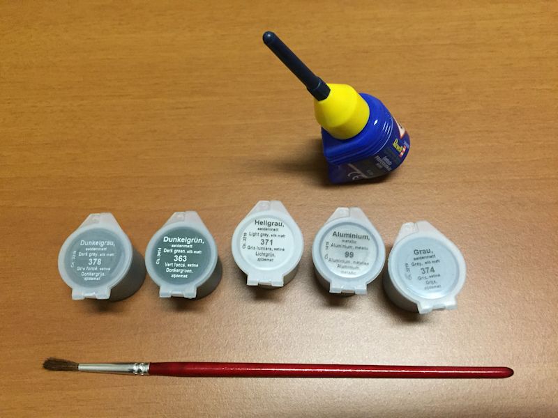 Dem Bausatz sind fünf Töpfchen mit Acrylfarbe beigefügt. Dunkelgrau, grau, hellgrau, dunkelgrün und Aluminium reichen schon für einiges an Bemalung. Dazu gibt es einen Pinsel, dem man zumindest eine Chance geben sollte. Die kleine Flasche Klebstoff ist auch nicht fehl am Platz.