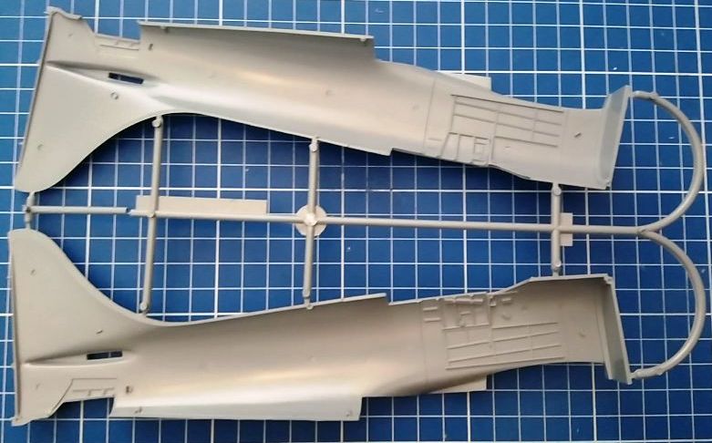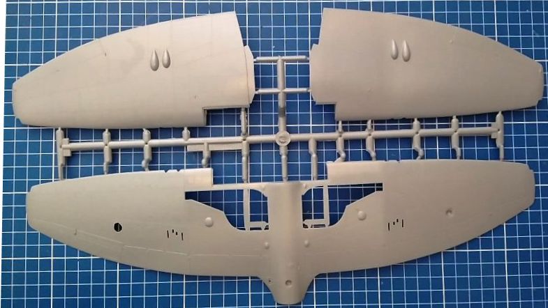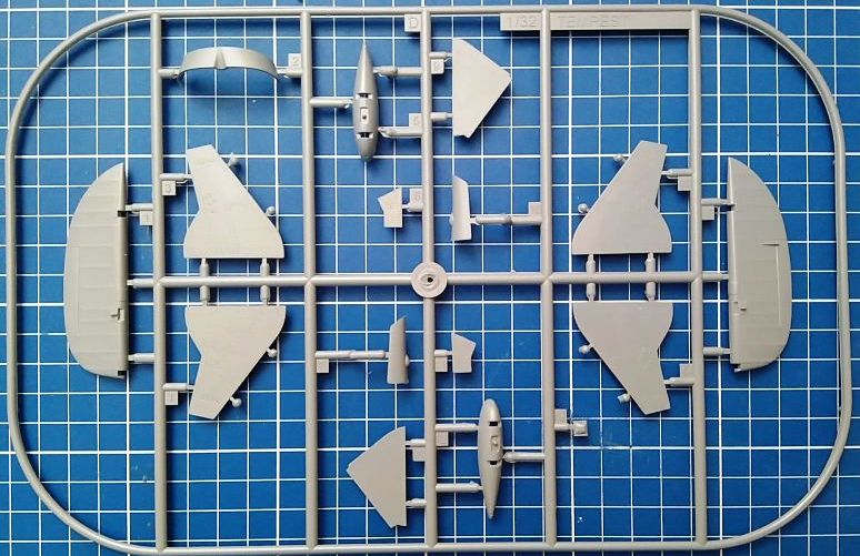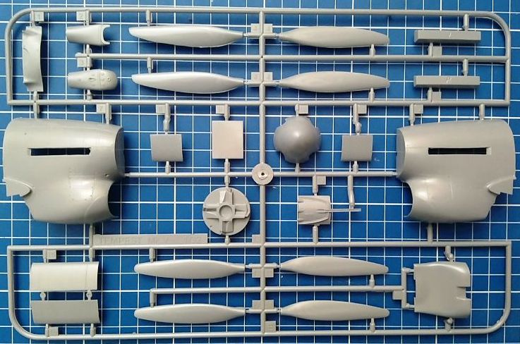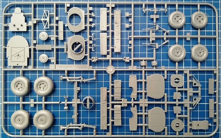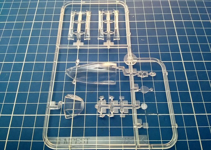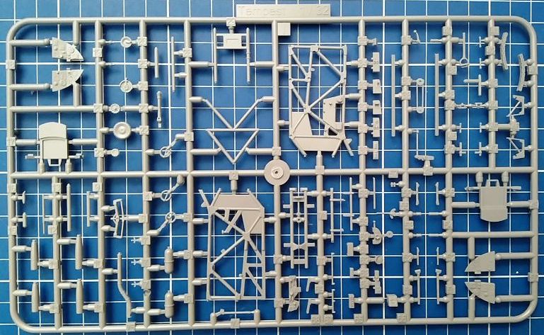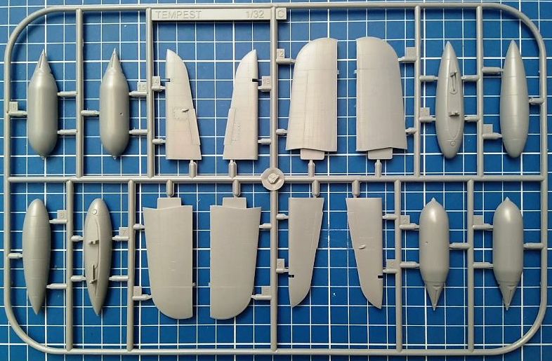 Etwas spartanisch in nur einer großen wiederverschließbaren Tüte verpackt, finden sich an sieben grauen und einem klaren Spritzrahmen 255 graue und 16 klare Teile. Die Klarteile sind glücklicherweise noch einmal in einer kleinen extra Tüte verpackt, um sie vor Schrammen zu schützen. Die Gießrahmen sind relativ dünn und die Angusszapfen schmal. Der Guss ist sauber, fast ohne Grat, die Auswerfermarkierungen sind an unauffälligen Stellen platziert. Dort, wo stärkere Strukturen auf der Rückseite nachgebildet sind, finden sich leichte Sinkstellen, die aber so dezent sind, dass man sie auch als Stressed Skin "verkaufen" kann. Die Oberflächen-Details bestehen aus sehr fein versenkten Gravuren und Myriaden von versenkten Nieten und Schraubverschlüssen sowie erhabenen Details. Das Ganze erscheint ein wenig wie eine gedopte Eduard-Tempest, obwohl diese natürlich erst später erschienen ist.