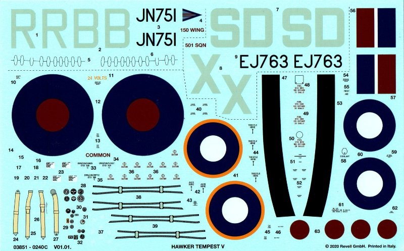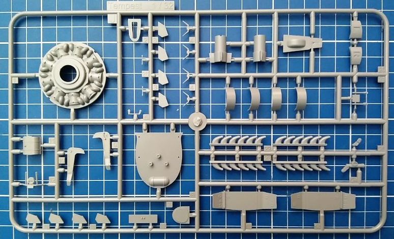 Bausatz: Hier handelt es sich um eine von Revells typischen Wiederauflagen eines Kits eines anderen Herstellers, diesmal von Special Hobby von 2016. Um eine "große" Tempest zu bauen konnte man, wenn man nicht den Vaku-Kit von ID Modells verwenden wollte, ab 2013 auf Pacific Coasts Mixed-Media-Kit zurückgreifen. Ab 2016 erlöste Special Hobby die Fans mit einem Voll-Spritzguss-Kit. Der Zubehör-Markt hat sofort reagiert und von CMK und Barracuda erschien viel Resin in Form von Rädern, Cockpit-Zubehör und sogar eine Pilotenfigur. Natürlich gibt es auch Fotogeätztes z.B. von Eduard und Masken von Montex und Eduard, so dass man sich beim Aufhübschen richtig austoben kann.