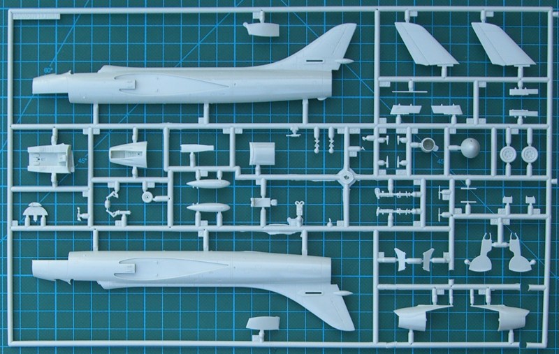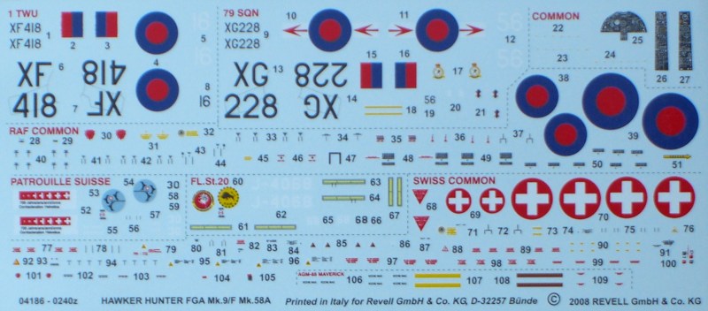 Der Bausatz in einer unpraktischen Schüttelbox enthält fünf Spritzgussrahmen und einen Rahmen mit Klarsichteilen. Schon aus der Kiste lässt sich ein ordentliches Modell erstellen. Das Cockpit ist sehr gut detailliert. Der Schleudersitz ist ein Modell für sich. Interessant ist auch beim 72er Bausatz die vorbildgerechte Gestaltung des Triebwerkseinlaufes. Bei der FAG. 9 und der Mk. 58 fällt natürlich das neugestaltete Heck ins Auge. Das hat Revell sehr gut umgesetzt. Vor der Montage der Tragflächen müssen noch ein paar Bohrungen angebracht werden. Danach muss man schon ein wenig aufpassen, das die notwendigen Teile für die richtige Version verbaut werden. Bei den Landeklappen muss u.a. ggf. gespachtelt werden. Die Schiebehaube kann auch in geöffneter Position montiert werden. Der Decalbogen (Abziehbilder) ist sehr umfangreich. Dadurch sind sehr viele Wartungshinweise vorhanden. Alle Decals sind versatzfrei auf hellblauem Trägerpapier gedruckt.