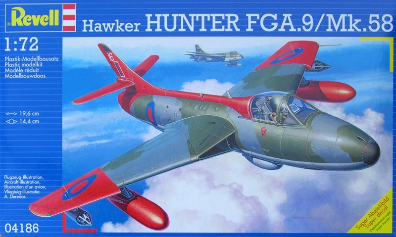 Bausatz: Revell hat die Hunter F.Mk. 6 in 1/72 speziell für den britischen Markt entwickelt. Auch in Deutschland hat dieses sehr gute Modell seine Anhänger gefunden. Schon sehr früh war klar, dass es auch die Versionen FGA. 9 und Mk. 58 geben wird. Erstere ist doch die meistgebaute Version.