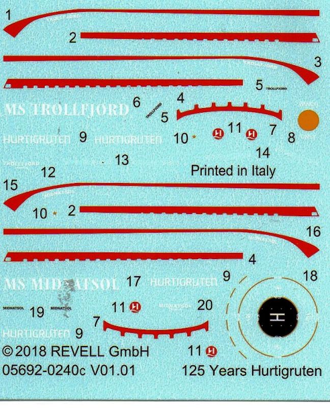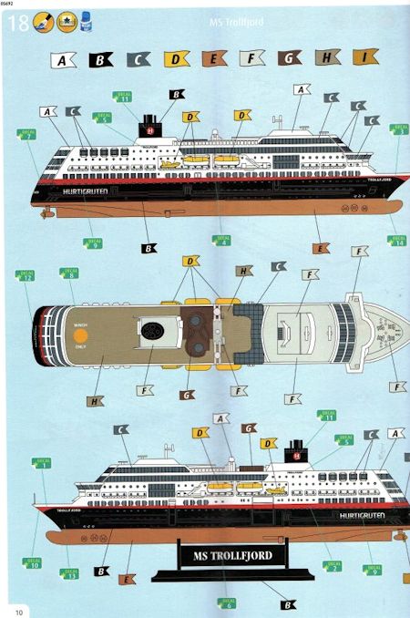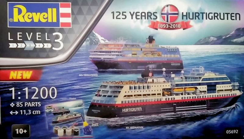 Bausatz: Die Wiederauflage eines Bausatzes, der ursprünglich nur ein Schiff der norwegischen Reederei enthielt, kommt in einer attraktiven aber unpraktischen Schüttbox daher. Sie enthält die annähernd identischen Schiffe MS Midnatsol und MS Trollfjord, die sich nur in einem einzigen Gussrahmen unterscheiden.