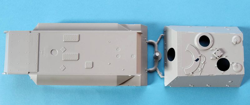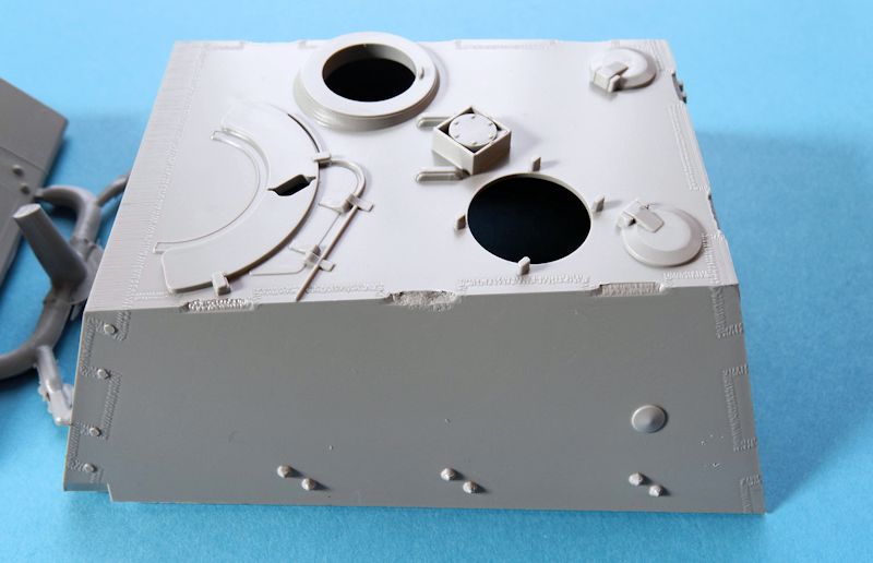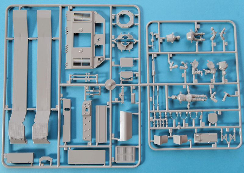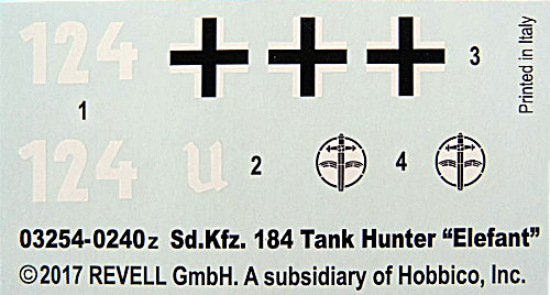 Bausatz: Revell hat hier die alten Formen von Italeri übernommen, was das Logo auf der Unterseite der Wanne deutlich macht. Die 238 Teile sind übersichtlich auf drei Spritzlinge plus Vinylketten verteilt. Die Qualität ist ausreichend und erlaubt eine schnelle Fertigstellung. Das Alter der Formen lässt sich jedoch nicht leugnen. So gibt es einige ungünstig platzierte Auswerferstellen und auch sichtbare Sinkstellen an den Kettenabdeckungen. Der Bausatz enthält insgesamt drei Figuren, von denen zwei in sitzender Position als Fahrer und Funker dienen. Für diese sind in der Wanne immerhin die Arbeitsplätze rudimentär dargestellt. Für das Modell hat der Zubehörmarkt schon einiges an Teilen herausgebracht, wodurch sich dieser Panzerjäger durchaus mit aktuellen Bausätzen messen kann. So kann man, je nach Geldbeutel, die weitere Detaillierung erhöhen.