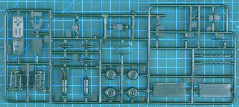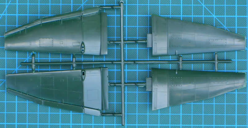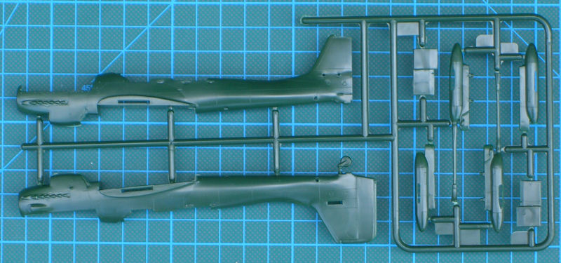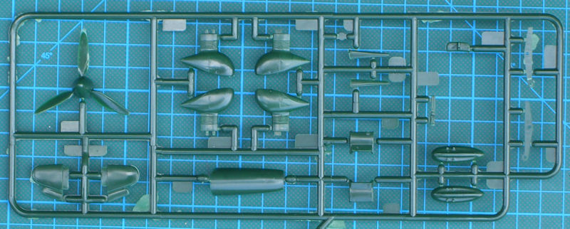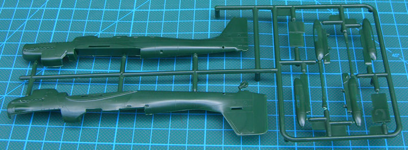 Die vier grünen Spritzrahmen besitzen 61 Einzelteile. Dazu kommen eine einteilige Klarsichtkanzel und der gut gedruckte Decalbogen. Alle Bauteile besitzen feine erhabene Strukturen und entsprechen dem Stand der damaligen Zeit. Die Details sind etwas einfach gehalten. Erstaunlicherweise gibt es beim Pilotensitz aufmodellierte Sitzgurte und insgesamt ein Cockpit welches eine Grundausstattung besitzt. Für das Instrumentenbrett gibt es ein Decal. Auch eine einfache Motorreplik gibt es hier. Die Hinterkanten der Ruder sind scharfkantig und daher gut gelungen.