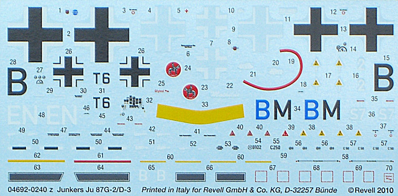 Revell hat es nach wie vor nicht geschafft vernünftige RLM-Farbtönen selbst zu produzieren. Sie werden in der Bemalungsanleitung immerhin benannt. Gut gelungen ist der exzellente sowie fehlerfrei gedruckte Decalbogen mit seinen vielen Wartungshinweisen.
