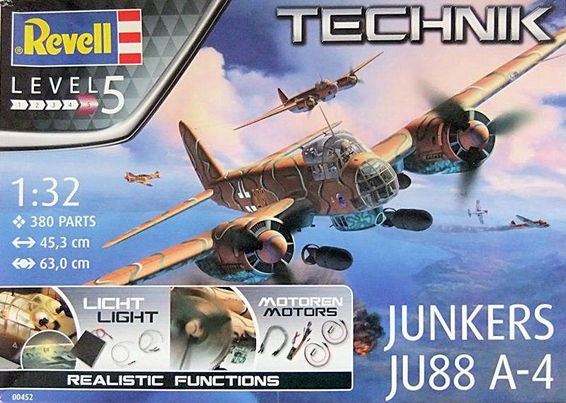 Bausatz: Der Grundbausatz ist nicht neu aber in diesem Maßstab einmalig. Die Ausführung in der Technik-Reihe ist jedoch ein Novum. Zuerst einmal die wichtigsten Daten, wie sie auf den großen Stülpkarton vermerkt sind: Einzelteile: 380, somit wird der Schwierigkeitsgrad als Level 5 bewertet. (siehe Anmerkung) Insgesamt ist der Bausatz identisch mit dem Modell, das schon im Jahre 2008 als Ju 88 A-1 auf den Markt kam. 2013 folgte dann die Variante A-4.
