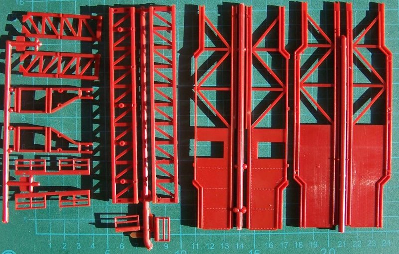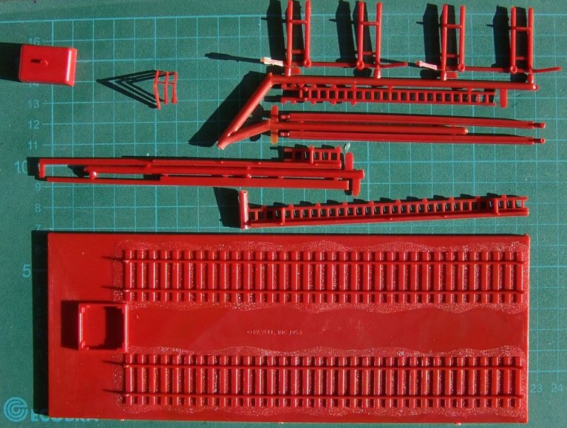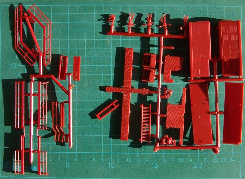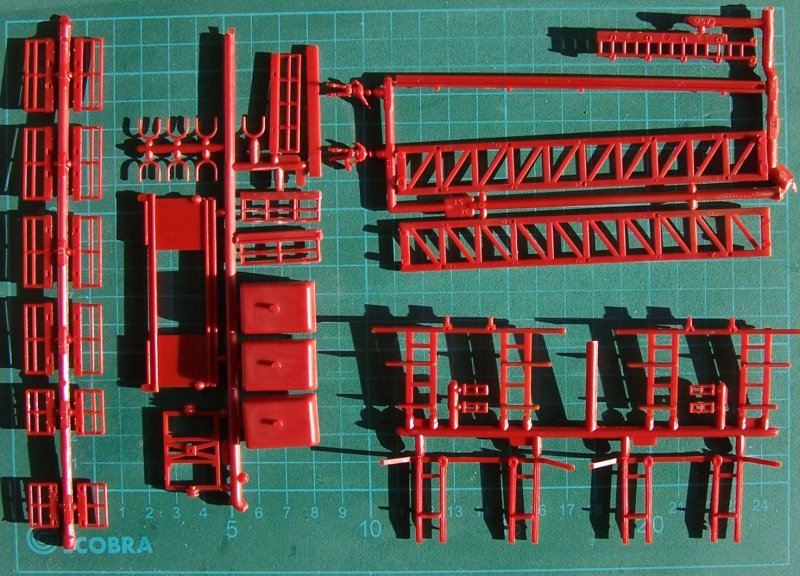 Bausatz: Wie bei dem Modell der Startanlage der Atlas-Rakete (Revell) und dem Startturm des Space Shuttle (Revell) ist auch hier alles dabei, was so ein Stahlgerüst eben ausmacht. Wer jetzt kein Mini-Cape-Canaveral Zuhause haben möchte ist selber Schuld. Die Teile sind üblicher Spritzguss, die Bauanleitung erinnert an Häuschen einer Modellbahnanlage. Was ja nicht schlecht ist. Alle Teile der Startanlage sind in rotem Plastik gegossen, die Rakete selbst ist weiß. Für Kinder zum einfachen Bau geeignet eben.