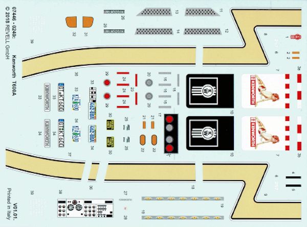Bausatz: Der T600 ist ein alter Bekannter aus dem Hause Revell - USA der 1992 erstmalig als Snap-Tite Bausatz in der Sattelzugversion "K-Mart / Havoline Race Rig" erschien und 1998 von Revell - Deutschland eg ohne Auflieger als Easy-Kit weiter vertrieben wurde. Der Baussatz ist im Level 3 mit seinen 61 Teilen einfach gehalten - er soll ja schließlich die jungen Modellbauer mit 10 Jahren ansprechen.