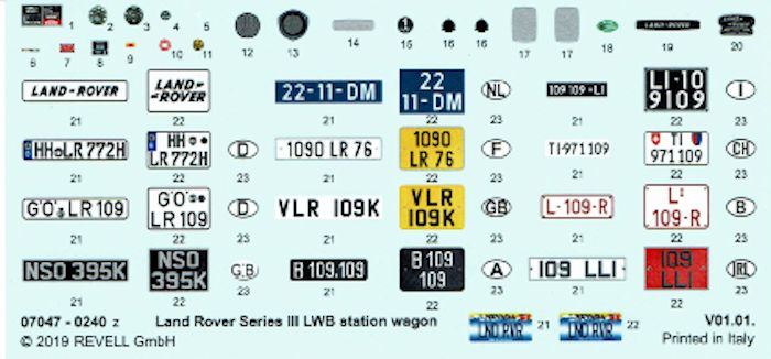 Bausatz: Als der Land Rover im letzten Jahr von Revell in Bünde angekündigt wurde, dachten viele an eine Wiederauflage bzw. Formentausch des schon in die Jahre gekommenen Landys aus dem Hause Italeri. Dem ist zu Glück nicht so. Revell liefert hier wirklich eine echte Neuheit aus, und die kann sich wirklich sehen lassen. Der Bausatz besteht aus insgesamt 184 Teilen verteilt auf 15 Gussästen, einer Karosserie, fünf Vinylreifen und einem Decalbogen. Die Details sind sehr gut gelungen. Die Oberflächenstrukturen sind hervorragend wiedergegeben.