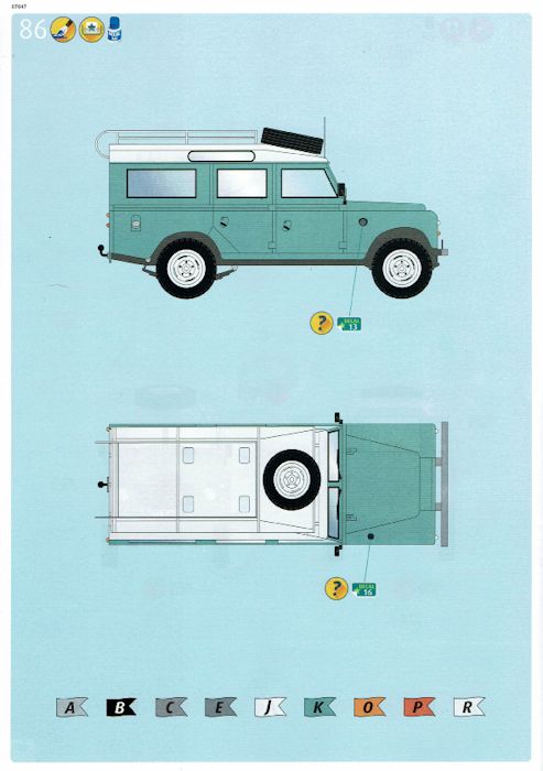 Die Lenkung ist sogar bei diesem Modell beweglich - hervorragend! Und da wie gerade bei der Lenkung sind, hier hat der Modellbauer die Wahl beim Bau zwischen einem Links- und einem Rechtslenker was sich hauptsächlich dann in der Innenausstattung bemerkbar macht. Hierzu liegen zwei Armaturenbretter bei. Das Innenleben des Land Rovers gestaltet sich ebenfalls variabel. So verfügt das Modell über Sitzvarianten, die in der Bauanleitung eindeutig beschrieben werden. Der Rest beschränkt sich auch die seitlichen Innenverkleidungen.