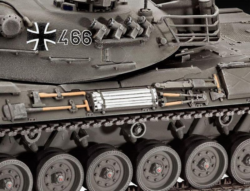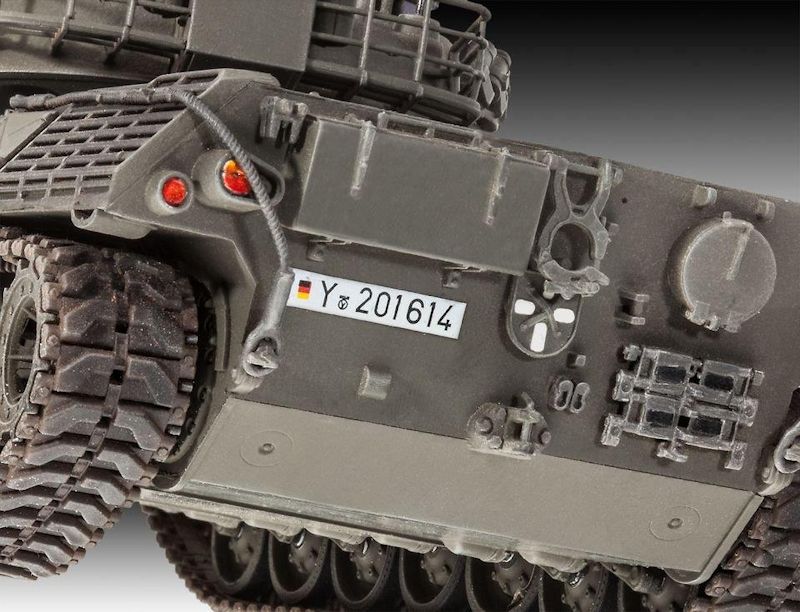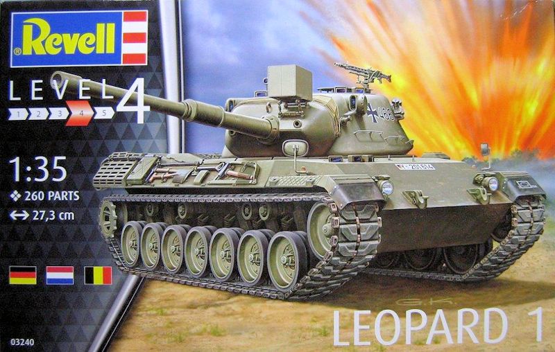 Bausatz: Endlich wagt Revell den Schritt nach vorn und bringt den Leopard 1 (frühere Baulose 2 bis 4) auf den Modellbaumarkt. Nach dem die fernöstlichen Hersteller mit dem Leo1A5 anfingen, war nur zu hoffen das auch ein früheres Baulos folgen wird. Umso größer war die Überraschung das Revell diesen frühen Typ heraus bringt. Das Vorabmodell auf der Spielwarenmesse 2015 konnte schon überzeugen. Rechtzeitig zum Weihnachtgeschäft war dann der neue Leopard 1 bei den Fachhändlern bereit zum Verkauf. Was die Qualität und Teilevielfalt betrifft kann sich der Revellkit durchaus mit seinen fernöstlichen Konkurrenten messen, der günstige Verkaufpreis wird ein weiteres dazutun.