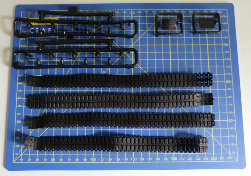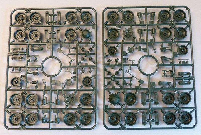 Zum Bausatz: In der großen Schüttbox, befinden sich auf sieben in Dunkelgrün gespritzten Gußästen über 200 Bauteile. Leider besteht die einzelne Vinylkette aus jeweils zwei Einzelstücken. Abschleppseile und die Schmutzfänger, für das Heck liegen ebenfalls aus diesem Material bei. Die Fahrzeugwanne besteht aus sechs Einzelteilen! Hier finde ich aber die altbewährte Methode besser. Wanne aus einem Teil, das Heck hinten angeklebt und das Oberteil drauf.