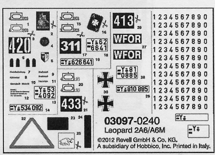Lackierung und Decals: Revell greift ausschließlich, auf sein Farbenprogramm zurück. Hier kann man zwischen Email und den AQUA COLOR (Acryl Farben) wählen. Eine Fünfseiten Ansicht vereinfacht die Lackierung des Modells mit der Tarnbemalung. Der gute Decalbogen auf den sich auch Wartungsanweisungen befinden erlaubt den Bau von vier Fahrzeugen.